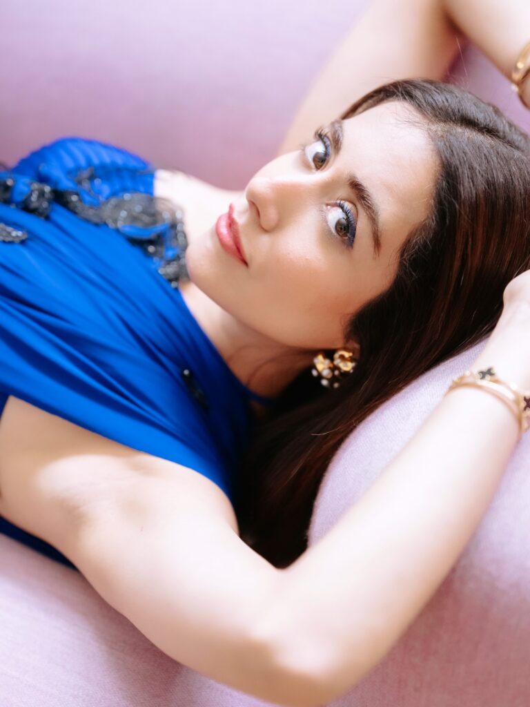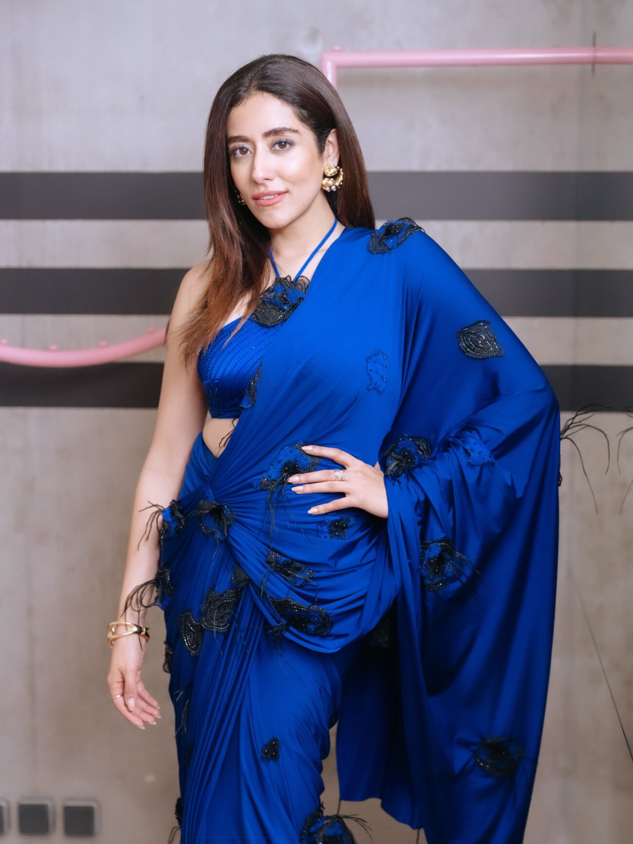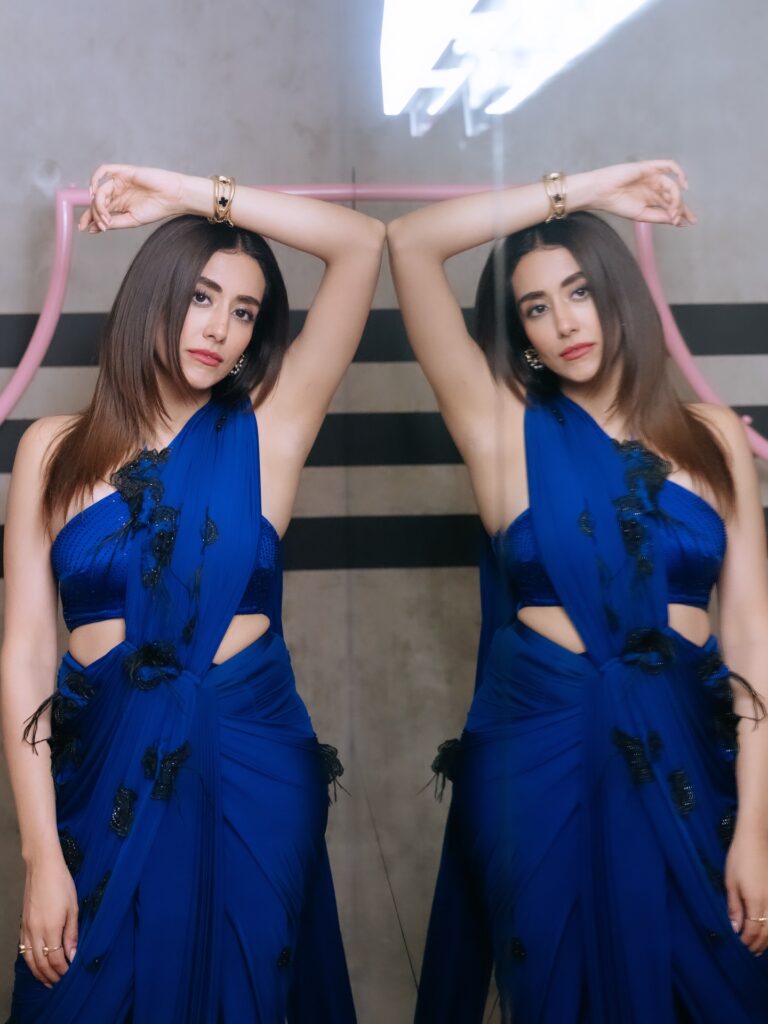 - The Blouse (Bralette Style): She has paired the saree with a matching blue one-shoulder bralette. The asymmetrical neckline of the blouse blends into the pallu drape, creating a continuous, streamlined silhouette that feels more like a gown than a traditional saree.