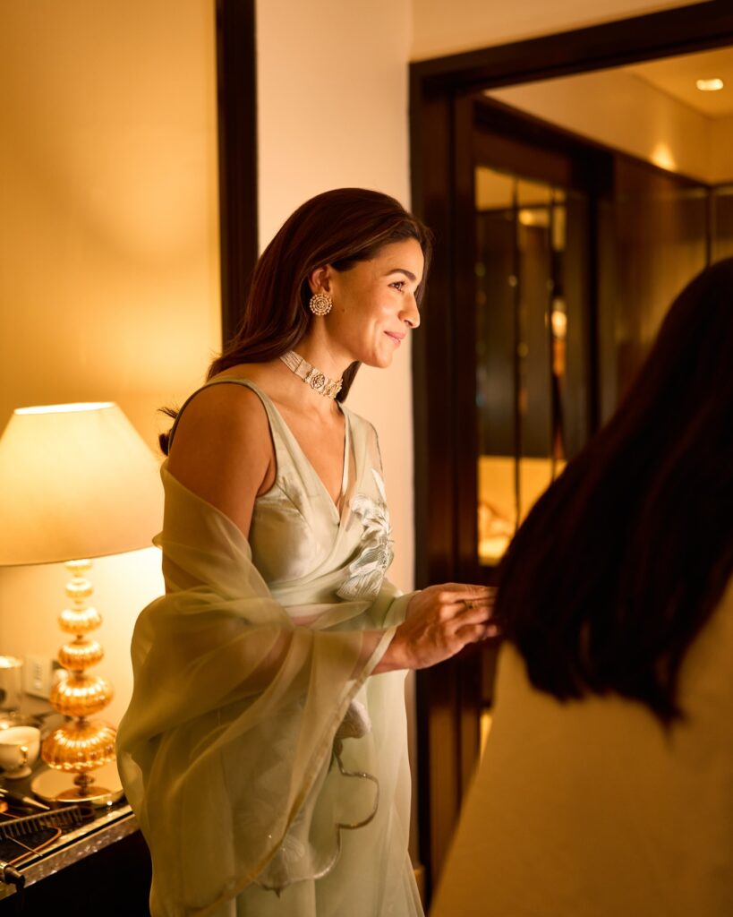 Alia Bhatt is known for her graceful and modern fashion sense, and this look reflects her signature style—wearing a soft pastel organza saree with a contemporary blouse, minimal yet elegant design, and natural beauty that creates a refined, effortless, and timeless appearance.