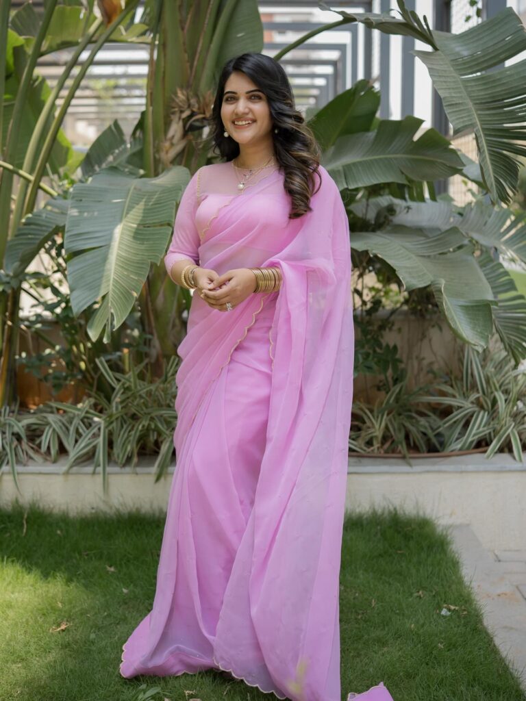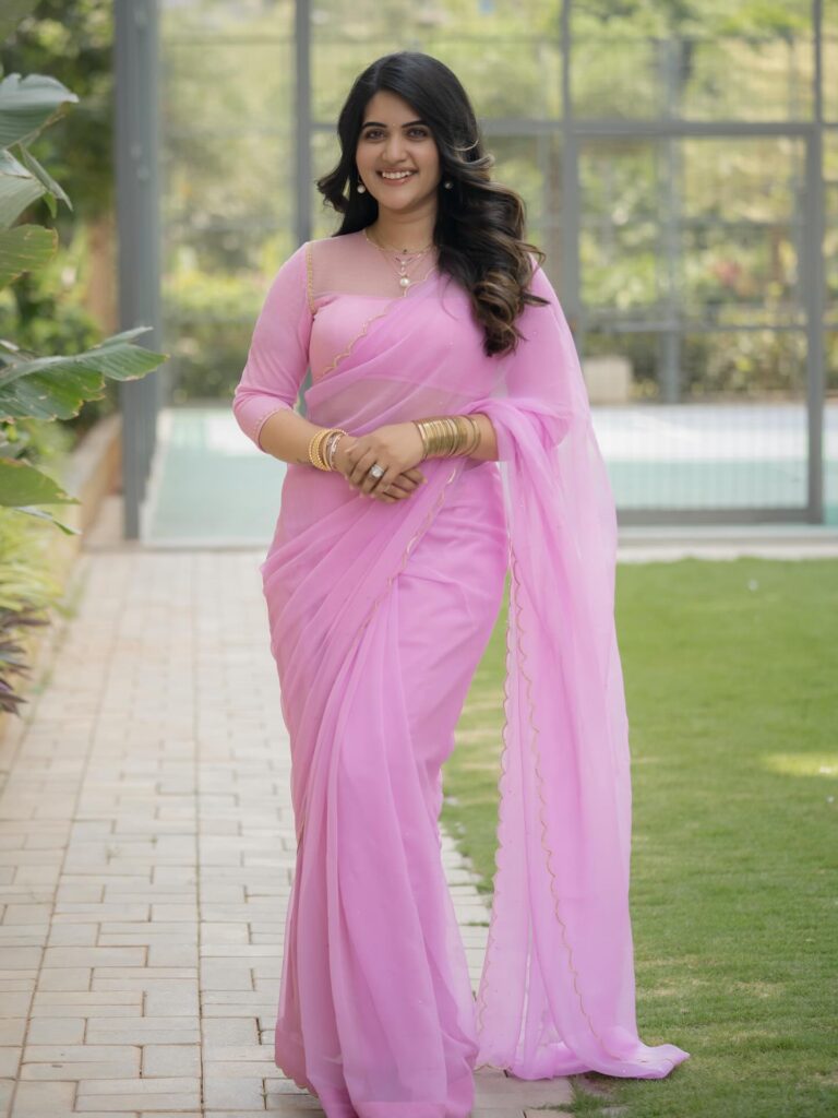 The outfit is a monochromatic pink saree crafted from a lightweight, translucent fabric—likely chiffon or georgette. This material is chosen for its fluid drape and delicate texture, which allows the garment to flow naturally with movement.
