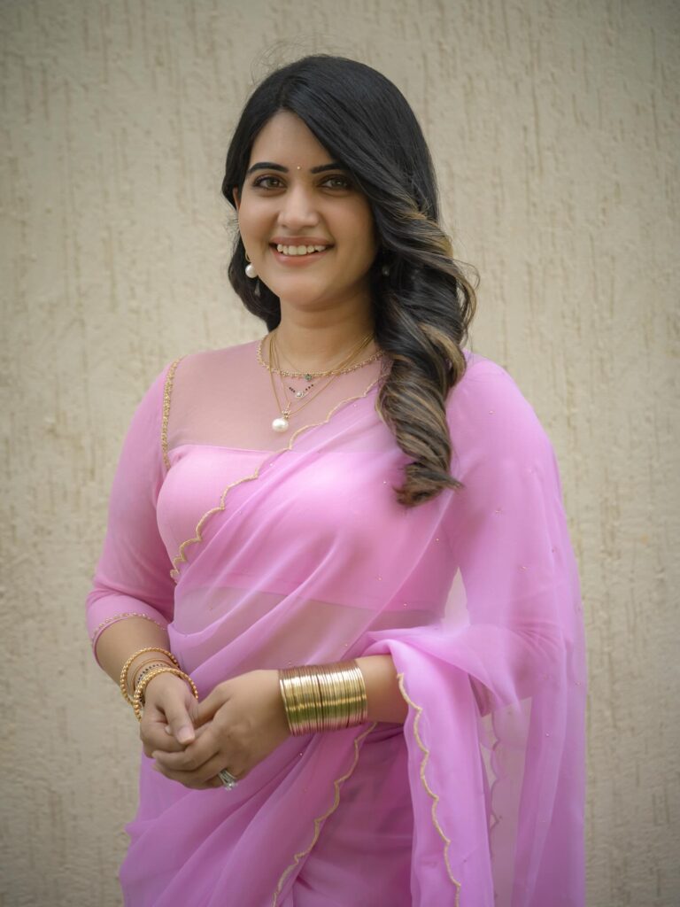 • The Blouse: She has paired the saree with a matching pink blouse that features a sheer illusion neckline. The three-quarter sleeves and the high neckline keep the look sophisticated and formal, while the sheer panel adds a modern, trendy touch.