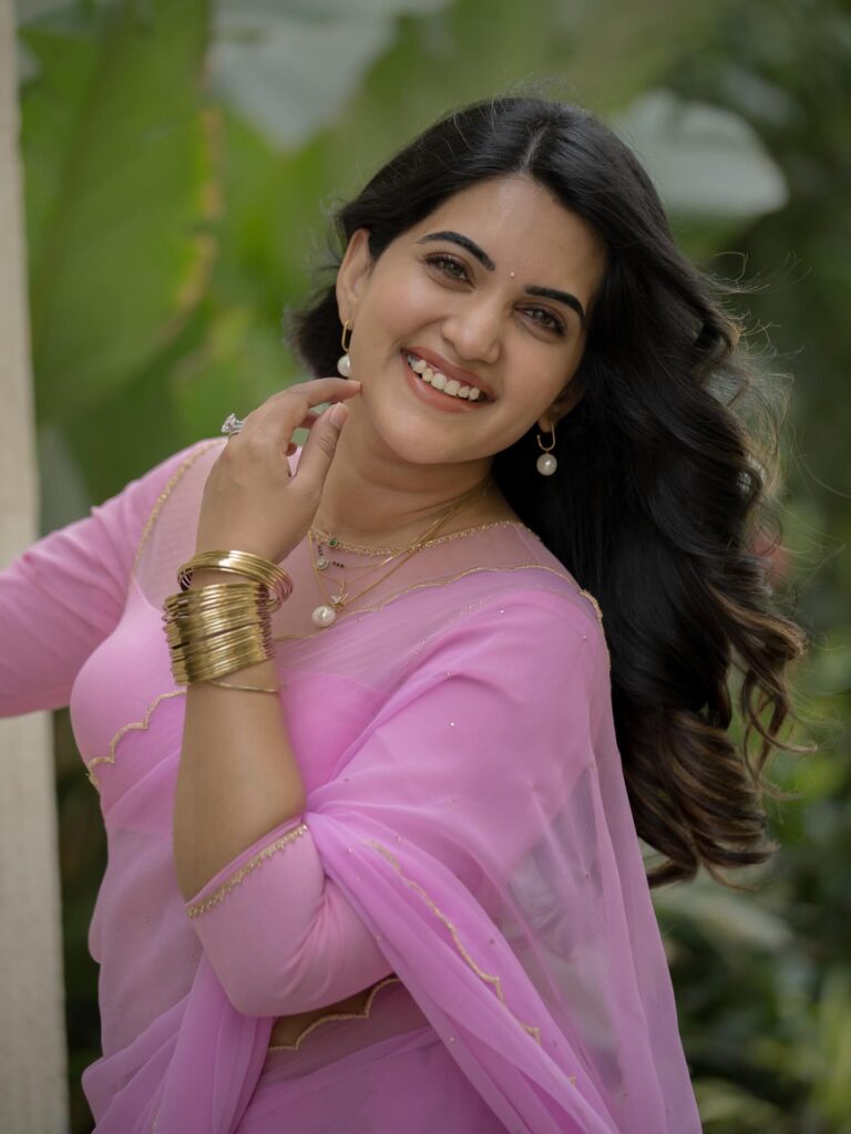 • The Waistline: The saree is tucked neatly to define the waist, a signature of Sravanthi’s styling which often emphasizes a clean, feminine shape.